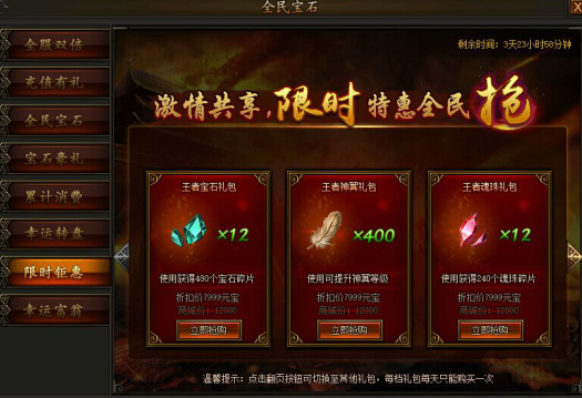 活动期间,宝石、羽毛、魂珠、内功、轮回和成就等材料礼包限时折扣,超低价格,不容错过!